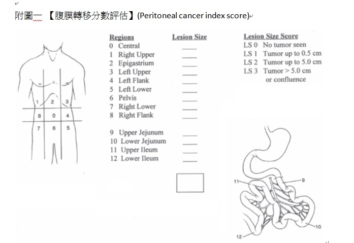 - 目前以Pro. Sugarbakar所提出的【腹膜轉移分數評估】(Peritoneal cancer index score) 來進行監測評估(見附圖一),包含轉移範圍及腫瘤大小,滿分為39分,最少1分。若PCI分數大於20分,則對患者無明顯幫助